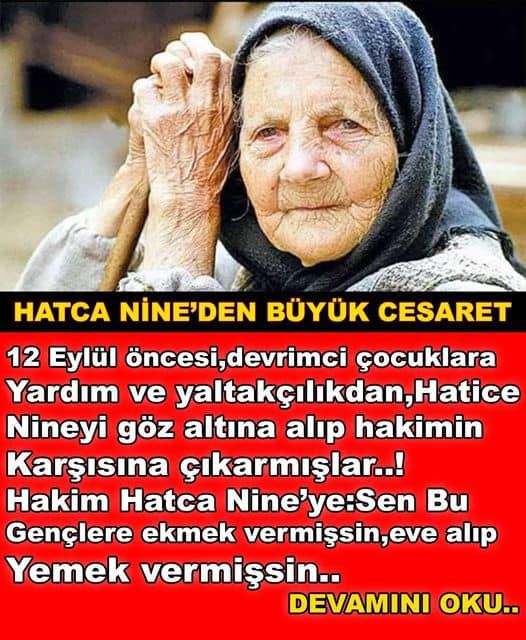 12 Eylül öncesi, devrimci çocuklara yardım ve yatakcılıkdan, Hatice nine’yi göz altına alıp hakimin karşısına çıkarmışlar…! Hakim Hatca nine’ye: Sen bu gençlere ekmek verirmişsin… “12 Eylül öncesi, devrimci çocuklara yardım ve yatakcılıkdan, Hatice nine’yi göz altına alıp hakimin karşısına çıkarmışlar…! Hakim Hatca nine’ye: Sen bu gençlere ekmek verirmişsin, eve alıp yemek verirmişsin öyle mi demiş?…. Hatce Nine: Hakim bey gül yüzlü çocuklardı, kapıma gelirlerse onlara yemek ekmek verirdim; sonra ben kapıma gelene sofra açmadan salmam ki demiş…