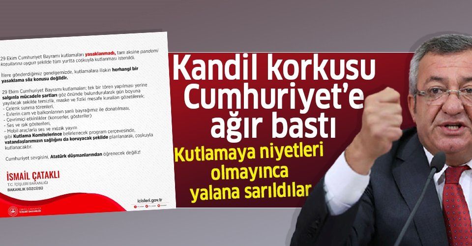 Bakanlığın net açıklamalarına rağmen hala "kutlamalar yasaklandı" yalanına sarılan ve Cumhuriyet Bayramı'nı kutlamaya niyeti olmayan YCHP yönetimi kışkırtıcı , Türk milletini bölmeye yönelik tutumunu sürdürdü.