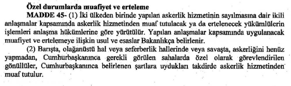 'Özel durumlarda muaf ve erteleme' başlığı ile yer alan maddeyi Twitter hesabından paylaşan Çelebi, "Yeni Askerlik Yasası Madde 45 2. Fıkraya dikkat!
