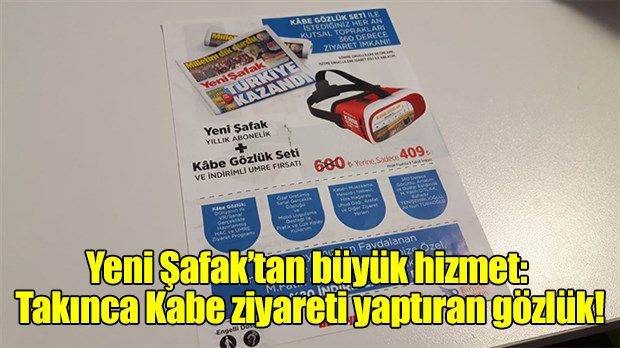 Gazetenin bugünkü sayısında okurlarına yönelik bir kampanyanın broşürü yer aldı. Broşüre göre Yeni Şafak gazetesine yıllık abonelikle birlikte takınca Kabe’yi gösteren bir gözlük seti ve indirimli umre fırsatı 409 TL’ye satılıyor.