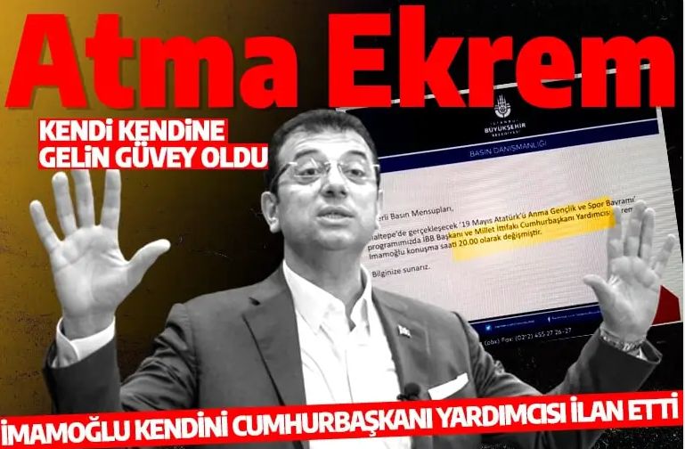 Türkiye'de seçim ikinci tura kalsa'da Erdoğan'ın ilk turu önde kapatması muhalif kesimde büyük yankı uyandırdı. Durumu kabullenemeyen Millet İttifakı'nın her adayın her gün gülünç sayılacak açıklamalar ve algılar geliyor. Bunun son örneğini İstanbul Büyükşehir Belediyesi Başkanı Ekrem İmamoğlu tarafından geldi. İstanbul Büyükşehir Belediyesi'nin resmi internet sitesinde yapılacak programda İBB Başkanının ünvanı 'Cumhurbaşkanı Yardımcısı Ekrem İmamoğlu' denildi.