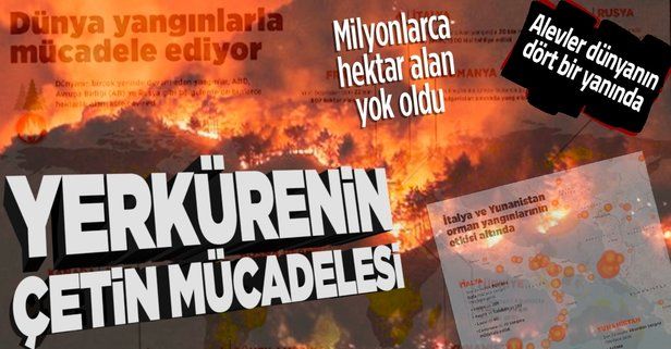 ABD Havacılık ve Uzay Ajansının (NASA) "FIRMS" adını verdiği Yangın Bilgilendirme ve Kaynak Yönetimi Sistemi'nin uydu haritasına göre, kırmızı noktalarla gösterilen yangınlar dünyanın birçok yerine yayılmış durumda. Asya'da ise Hindistan kıyıları, Rusya'nın Sibirya bölgesi, Çin, Malezya, Endonezya ve Okyanusya'da Avustralya'nın doğusu orman yangınlarının etkisinde bulunuyor. Yangınlar yerkürenin pek çok ormanlık bölgesini kırmızıya boyarken, Türkiye'nin yanı sıra İtalya, İspanya, Yunanistan gibi Akdeniz'e kıyısı bulunan Avrupa ülkeleri de orman yangınlarıyla mücadele ediyor. AB Komisyonunun orman yangınlarını gösteren acil durum haritasına göre de kıtanın tamamındaki irili ufaklı yangınlar neredeyse Rusya'nın kuzeyine kadar ulaşıyor. Uydu haritasında AB ülkelerinde farklı boyutlardaki yangınların en az 1 haftadır sürdüğü görülüyor. İtalyan itfaiyesinden yapılan açıklamaya göre, ülkede son 24 saatte 800'den fazla noktada yangın meydana gelirken, itfaiye ekipleri Sicilya'da 250, Puglia ve Calabria'da 130, Lazio'da 90 ve Campania'da 70 yangına müdahale etti. Yerel basında çıkan haberlerde de Sicilya ve Sardinya adaları ile Kalabriya bölgesinin farklı noktalarında çıkan yangınlar neticesinde binlerce hektar arazinin kül olduğu belirtildi. Sardinya Adası'nın batısındaki Oristano vilayeti kırsalında 24 Temmuz'da çıkan yangında 20 bin hektar arazi yandı, 1500 kişi tahliye edildi. Bölgede soğutma çalışmaları devam ediyor. Yangınla mücadele için İtalya kendi uçaklarına ek olarak AB ülkelerinden de yangın söndürme uçağı istedi. Sardinya Özerk Yönetim Başkanı Christian Solinas da yangında oluşan zararı şu an için hesaplamanın mümkün olmadığını belirterek, zararlarının telafisi için merkezi hükümetten acil ekonomik destek talep etti. Yerel basındaki haberlere göre, Tarragona bölgesindeki Santa Coloma de Queralt'ta çıkan yangında 1657 hektarlık alan kül olurken, bölgedeki yerleşimlerde bulunan 168 kişi yangın tehlikesi nedeniyle tahliye edildi. Yangınlar merkezi Patras kenti olan Ahaia bölgesinde, Rodos Adası'nda ve Türk Yunan sınırındaki Sofulu bölgesinde yoğunlaştı. Yunanistan'da başkent Atina yakınlarındaki Dionisos Belediyesine bağlı Stamata'daki ormanlık alanda 27 Temmuz'da çıkan yangın yerleşim yerlerine sıçradı. Dionisos Belediyesi yetkilileri, bölgede durumun çok zor olduğunu, ekiplerin müdahalelerine rağmen alevlerin yerleşim birimlerine yaklaştığını kaydetti. Yangının kontrol altına alındığı açıklandı. Yangın Fransa, İspanya ve Portekiz'e elektrik ileten hatlarda hasara sebep oldu. Portekiz Romanya Romanya'nın komşuları Moldova ve Ukrayna'da da orman yangınları sürüyor. İtalya'da bu sene 53 bin 797 hektar alan yanarken, 12 yılın ortalaması 40 bin 781 olarak kaydedildi. Fransa'da 22 bin 807 hektar yanarken, önceki yılların ortalaması 9 bin 283'tü. Romanya'da da aynı şekilde bu sene 18 bin 620 hektar alan yanarken, 12 yılın ortalamasının verisinin 16 bin 82 hektar olduğu belirtiliyor. Aynı sitede, AB üyesi olmayan ülkeler arasında Bosna Hersek'in de 25 bin 583 hektar alanı yangında kaybettiği, bunun 30 bin 199 olan 20082020 ortalamasına oldukça yakın olduğu gösteriliyor. Tunus'ta 17 bin 599 hektar arazi bu sene içinde yanarken bunun, 6 bin 257 hektar olan 12 yıllık ortalamayı çoktan geçtiği kaydediliyor. Rusya Federasyonu Federal Orman Ajansından yapılan açıklamada, dün 36 noktadaki yangınların kontrol altına alındığı belirtilerek, "1 Ağustos itibarıyla 217 noktada toplam 837 bin 813 hektar alanda orman yangınları devam ediyor. Yangınların 115'i Yakutistan'da, 51'i ise İrkutsk bölgelerinde bulunuyor." ifadelerine yer verildi. Bugüne kadar yaklaşık 1,3 milyon hektar ormanlık alanın küle döndüğü bölgede yetkililer acil durum ilan etti. ABD ve Kanada Dün çıkan 7 büyük yangınla ülkede aktif orman yangınlarının sayısı 91'e ulaşırken 1,8 milyon dönümden fazla arazi yangınlarda hasar gördü. Kanada'da da 2021 içerisinde 4 bin 891 yangın çıktı. Ülkenin önceki 10 yıllık ortalaması 3 bin 753'tü. Yangınlarda 2 bin 758 hektar arazi yandı. Önceki 10 yılda ortalama 1736 hektar arazi yangınlarda hasar gördü. Güney Amerika Patagonya'nın kuzeyindeki Rio Negro eyaletinde 7 Mart'ta kara yolu yakınında başlayan yangınlar kuzeye doğru ilerleyerek Atlantik Okyanusu kıyısındaki Buenos Aires'e kadar ulaştı. Her iki ülkede de geçen hafta meydana gelen sellerde onlarca kişi hayatını kaybetti. Avustralya Güney Yarım Küre'de yaz aylarına denk gelen aralık, ocak ve şubat aylarında acil durum çağrıları yarı yarıya azalırken, önceki yıla kıyasla az sayıda arazi yangınlarda tahrip oldu. Yangınlardan en fazla etkilenen Yeni Güney Galler eyaletinde geçen yıl 5,5 milyon hektar arazi yanarken, bu yıl 31 bin hektar arazi zarar gördü.