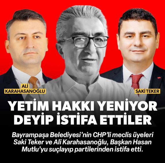 Bayrampaşa Belediyesi'nin CHP’li meclis üyeleri Saki Teker ve Ali Karahasanoğlu, CHP’li Belediye Başkanı Hasan Mutlu’yu "yetim hakkı yemekle" suçlayarak partilerinden istifa etti.