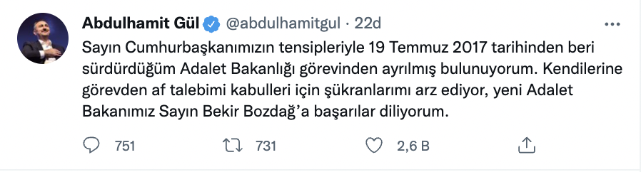 Gül, istifası sonrası kişisel Twitter hesabında yaptığı ilk açıklamada "Sayın Cumhurbaşkanımızın tensipleriyle 19 Temmuz 2017 tarihinden beri sürdürdüğüm Adalet Bakanlığı görevinden ayrılmış bulunuyorum. Kendilerine görevden af talebimi kabulleri için şükranlarımı arz ediyor, yeni Adalet Bakanımız Sayın Bekir Bozdağ’a başarılar diliyorum" dedi.