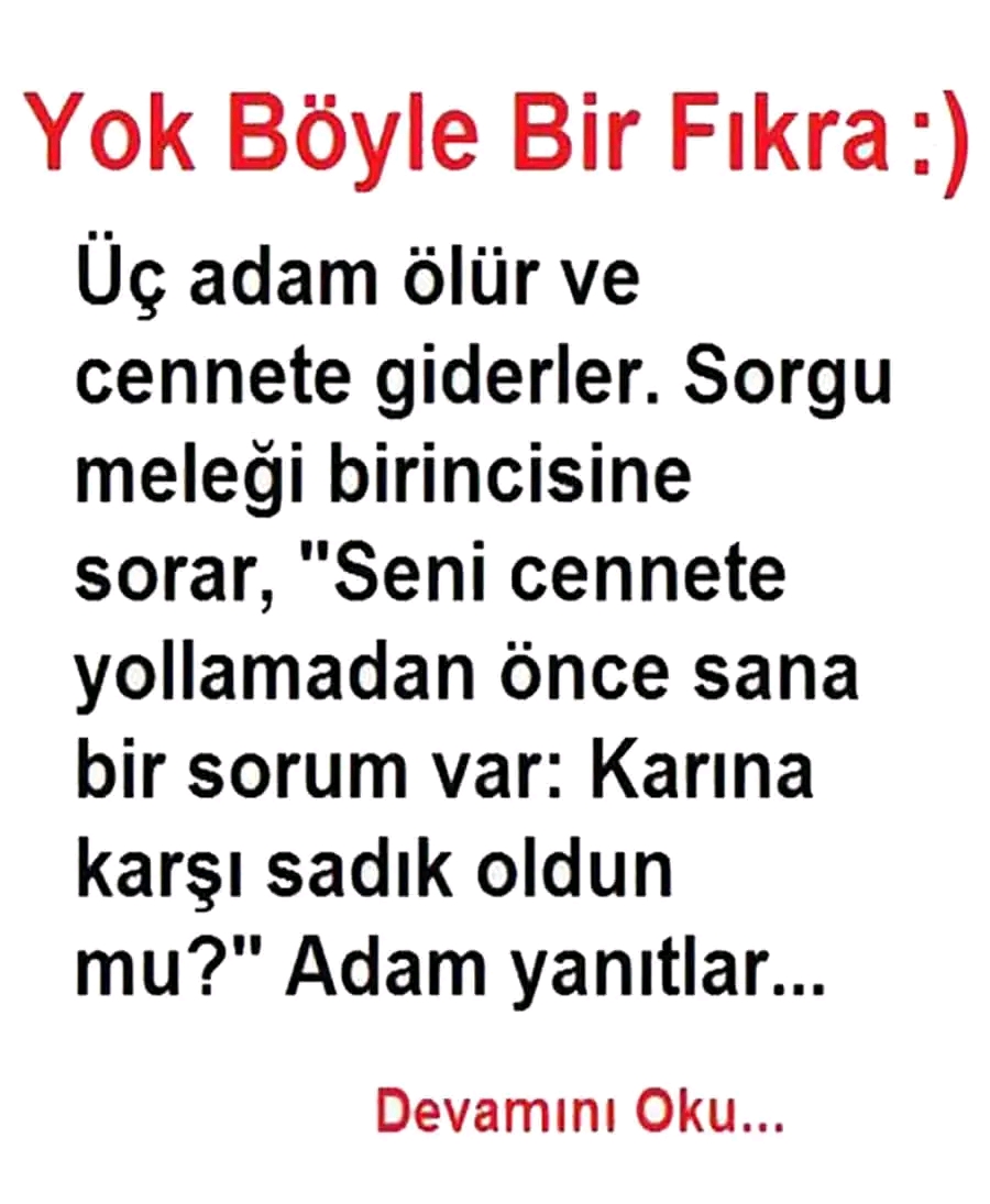 Sorgu meleği birincisine sorar, “Seni cennete yollamadan önce sana bir sorum var: Karına karşı sadık oldun mu?”