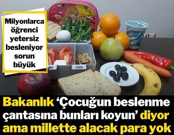 Sağlık Bakanlığı'na bağlı Halk Sağlığı Genel Müdürlüğü, öğrencilerin sağlıklı ve dengeli beslenmesi için örnek beslenme çantası menüsü hazırladı. Kahvaltıyla öğle yemeği arasında ‘ara öğün' olarak hazırlanan 1 haftalık örnek menüde süt, yumurta, zeytin, peynir, çiğ sebze ve meyve gibi gıdalar yer alıyor. Genel Sağlıkİş Sendikası markete gidip devletin önerdiği beslenme çantasını doldurdu. Ortaya çıkan fatura yoksulun bütçesini aştı. Bir öğrenci için bir haftalık örnek beslenme çantası 102 liraya doldu. Bir çocuğun 1 aylık sağlıklı beslenme çantası 408 TL'ye, iki çocuklu ailenin 816 TL'ye, üç çocuklu ailenin 1224 TL'ye çıktı.