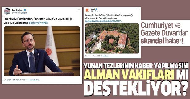 Cumhurbaşkanlığı İletişim Başkanlığı geçtiğimiz günlerde Türkiye'deki farklı dine mensup vatandaşların dini ve kültürel haklarının iyileştirilmesini konu edinen bir video hazırladı. Cumhuriyet Gazetesi ve Duvar adlı haber sitesi, İletişim Başkanı Fahrettin Altun'un; "Türkiye Cumhurbaşkanı @RTErdogan başkanlığında, eşitlik ilkesini geliştirmek ve milletimizin kültürel ve dini çeşitliliğini korumak için benzeri görülmemiş adımlar attı. Bu bölüm Rum Ortodoks Topluluğu'na odaklanıyor" notuyla paylaştığı videoya tepki gösteren Yunanistan merkezli bir kuruluşun Yunan tezlerini içeren iddialarını gerçekmiş gibi manşetlerine taşıdı. İstanbullu Rumların Evrensel Federasyonu adlı kuruluşun adeta Yunan propaganda metni olan açıklamasını manşetlerine taşıyan bu gazeteler sosyal medyada, "Yunanistan'ın nüfuz ajanlarının sesi mi oldunuz" tepkileriyle karşılaştı. Söz konusu kuruluşun açıklamasında övgüyle bahsettiği, Dersaadet Rum Cemiyeti'nin bizzat Atatürk tarafından kapatıldığı ise yine sosyal medyada birçok araştırmacı yazar tarafından dile getirildi. ATATÜRK'ÜN KAPATTIĞI CEMİYETİN DEVAMI…