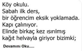 Köy okulu. Sabah ilk ders, bir öğrencim eksik yoklamada. Kapı çalınıyor. Elinde birkaç kez ısırılmış kağıt helvayla giriyor bizimki. “Özür dilerim öğretmenim” diyor. “Çerçi gelmişti de. Ondan helva alayım dediydim.”