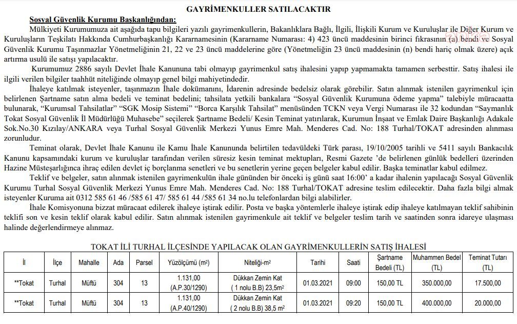 Kurumdan bir satış daha geldi. Sosyal Güvenlik Kurumu, Tokat’ın Turhal ilçesindeki 8 milyon 349 bin lira değerindeki taşınmazlarını satışa çıkardı. Resmi Gazete’de yayımlanan ilana göre SGK, büro ve dükkanlardan oluşan 79 taşınmazını, 15 Mart 2021 tarihleri arasında gerçekleşecek ihalelerle açık arttırma usulü satacak.